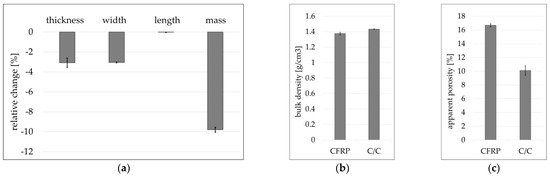 Figure 8 shows the relative change in dimensions and mass during pyrolysis. Furthermore, the bulk density and the apparent porosity of the CFRP and the C/C samples are displayed. The pyrolysis of CFRP to C/C results in a mass reduction of approx. 10%. The shrinkage of the specimens takes place only in the thickness and width direction. There is no change in the length direction. The bulk density is slightly higher in the C/C composite compared to the CFRP, whereas the apparent porosity in the C/C composite is lower than in CFRP.