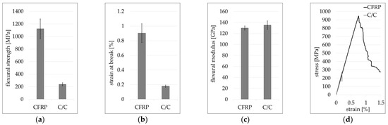 Figure 9 shows the mechanical properties of the CFRP and the C/C composites determined by four-point bending tests with typical stress–strain curves. The pyrolytic conversion of CFRP to C/C results in a reduction of flexural strength and strain at a break of approx. 80% for both values; the flexural modulus remains at the same level within the standard deviation though.