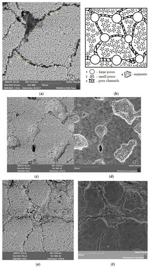 SEM BSE (a,c,e) and SE (d,f) images of as-sintered porous segmented ceramics. Scheme of the segmented structure with the indication of structural elements (b). Data for Sample #2 (a), Sample #1 (c,d), and Sample #4 (e,f) are shown.