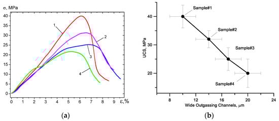 The monotonic compression “σ-ε” curves (a): 1—Sample #1; 2—Sample #2; 3—Sample #3; 4—Sample #4. UCS vs. wide pore channels curve (b).