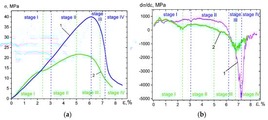 The monotonic compression “σ-ε” curve (a); the behavior of the “dσ/dε-ε” curve (b). Sample #1 (1) and Sample #2 (2) data are shown.