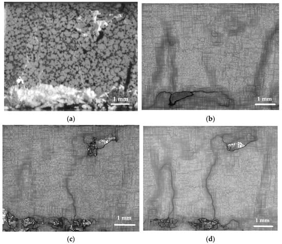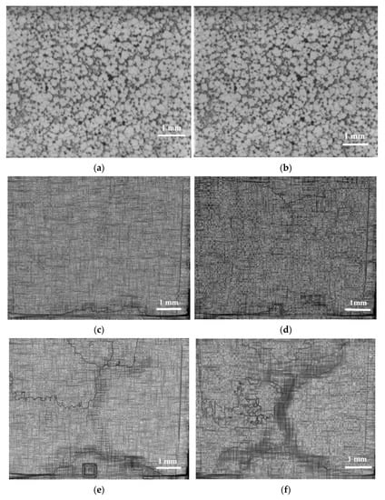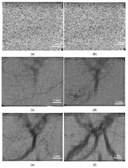 At this stage, both Sample #1 and Sample #4 lose their integrity and break into individual fragments with macrocracks (Figure 14a and Figure 15f). Corresponding pseudo-images show inelastic strain localization mainly in the form of thin lines (Figure 14b–d and Figure 15b–d), whose location coincides with that of the macrocracks in Figure 14a and Figure 15f.
