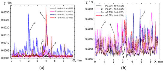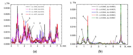 Spatial distribution of CPS rate γ (x, y = Ym/2), measured along the midline of Specimen #1 (a) and Sample #4 (b) at the deformation Stage III.