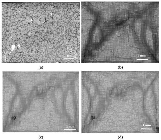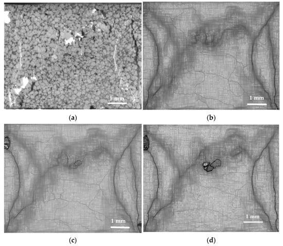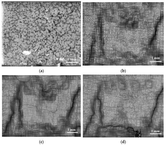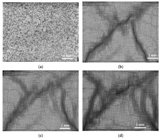 Compression of Sample #1 at Stage III allows observation of almost the same crack structure (Figure 11a) as that shown previously in Figure 8d. Further loading did not result in changing this fracture pattern. At the same time, the width of the macrobands decreased with increase in the strain, from ε = 0.064 to ε = 0.072 (Figure 11b–d), so that they were turning into thin lines. Sample#4 demonstrated the same tendency (Figure 12b–d).