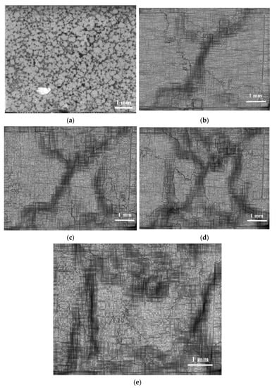 The primary cracks that formed in Sample #1 and Sample #4 can be observed on optical micrographs as bright areas (Figure 8a and Figure 9a). Moreover, additional SLMBs are generated in Sample #1 and Sample #4 as strain increases (Figure 8b–d and Figure 9b–e).