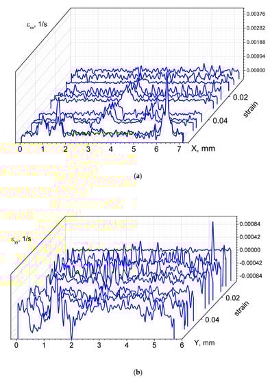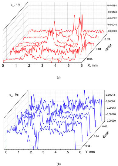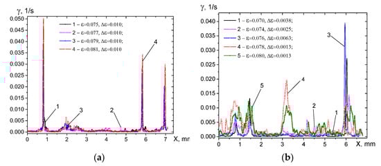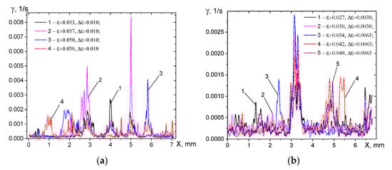 Figure 7 shows the CPS distribution along the x axis. The multiple local maxima are formed throughout the sample section already at small strain (at in Sample #1, Figure 7a; at in Sample #4, Figure 7b). It can be seen that, in the case of Sample #1, the number of local CPS maxima is substantially lower than that of Sample #4, and their location corresponds to emerging SLMBs (Figure 5c–f).