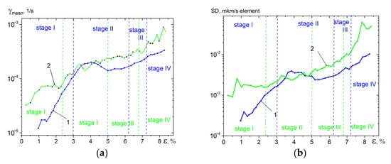 −the number of rows (columns) of arrays , , presented in discrete form. Here, the displacement standard deviation (SD), σn, is normalized to the time interval between two frames (or to the strain range). It is an important characteristic that makes it possible to single out the main stages of deformation and fracture and clarify their boundaries.