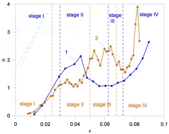 Evolution of the n = εxx/εyy ratio, with strain in Figure 20, can be additional evidence of low damage tolerance because the Poisson ratio value 0.9 at ε = 1.5% testifies that the elastic strain in Stage I is over, and the inelastic deformation stage has already started.