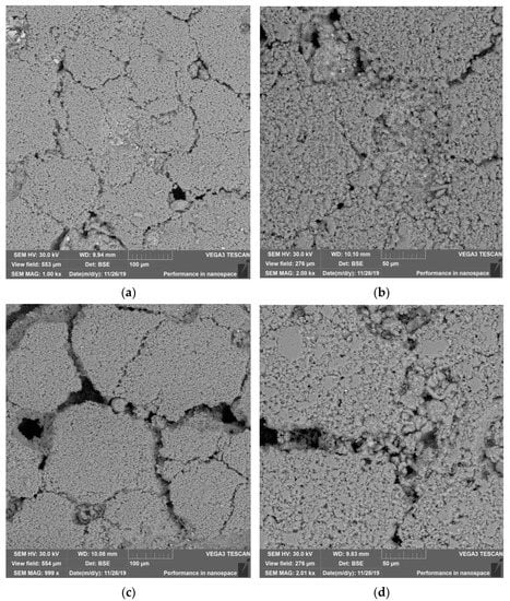 It is common to use the integral DIC approach with the reference image of non-loaded sample for investigating deformation and fracture of ceramic materials characterized by pseudo-plasticity behavior [6,23,24,25,26,27,28,29,30,31,32]. In this work, we used subpixel resolution that allowed us to use the differential approach and obtain pseudo-images of deformation bands (Figure 5c–f, Figure 6b–f, Figure 8c–f, Figure 9c–f, Figure 11c–f and Figure 12b–d). Let us note that there are no publications that would demonstrate the occurrence of the deformation bands on porous ceramic materials obtained with the use of the integral DIC approach.