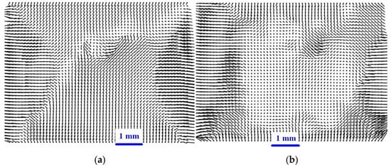 In this work, this threshold was chosen as , which means that the percentage of unidirectional vectors is exceeded by 5%. The calculation of the circulation was carried out at the spatial period of scanning by the contour . Such a small period leads to the fact that all possible vortex motions are taken into account. On the other hand, this leads to the fact that, when moving to a new section, the program often takes into account previously calculated contours again. This approach makes it possible to compare different samples, but individual quantitative characteristics should be approached with caution.