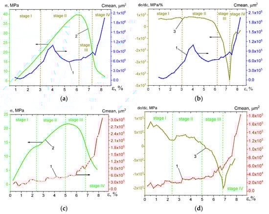 Strain-matched specific normalized circulation Cmean (1) with curves “σ-ε” (2) and “strain hardening- ε” (3) for Sample #1 (a,b) and for Sample #4 (c,d).