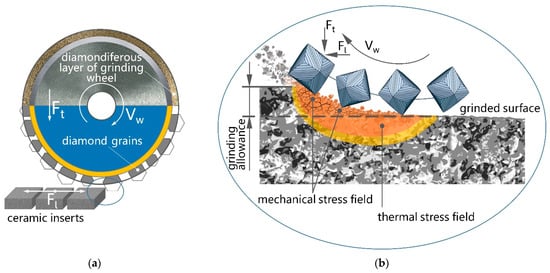 Diamond grinding of ceramics is a highly energy-intensive process in which the removal of a ceramic workpiece’s surface layer (allowance) to the required depth occurs due to creating stresses in it; the level of which, exceeds the fracture stress of tool ceramics [55,56]. Figure 1 shows diagrams of diamond grinding of ceramic cutting inserts and the impact of diamond grains on the surface layer of a ceramic workpiece when removing the allowance in grinding. The scheme proposed by the authors clearly illustrates that the sintered ceramic workpiece is subjected to a combined thermomechanical action during grinding, which destroys and removes the specified allowance. In this case, the thermal and mechanical impact area extends deeper than the cut allowance’s value.