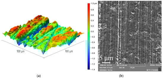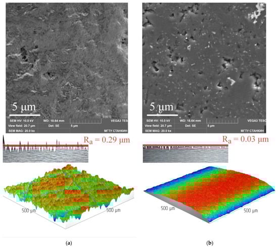 As confirmation that the use of the Ra parameter in a number of cases is not informative for assessing the level of defectiveness of the surface layer, let us consider the SEM images and 3D profilograms of the surface layer of samples made of Si3N4 tool ceramics after diamond grinding and polishing (Figure 4). After grinding, the value of the Ra parameter was 0.29 µm, and after polishing, the parameter decreased by 9.6 (to 0.03 µm). However, the result does not indicate a significant reduction in defectiveness, which is clearly seen in the presented SEM images. Polishing minimized external micro-irregularities (microprotrusions) but exposed the many existing craters in place of torn grains or their particles, which are not detected in evaluating the Ra parameter. At the same time, they negatively affect the physical and mechanical characteristics of the material. Therefore, it is necessary to search for alternative parameters for structurally inhomogeneous materials, which include ceramics and are characterized by the formation of numerous grooves, craters, and cracks during abrasive processing.