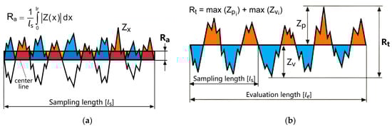 Schemes for various parameters estimating the state of the surface layer of ceramic samples after diamond grinding: arithmetic mean deviation of the profile, Ra (a); total profile height, Rt (b).