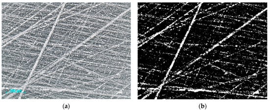 In practice, the most informative parameter that could be used to study the defectiveness of the surface layer of ceramic products is the Rt parameter which is the total height of the profile (Figure 3), estimated as the sum of the highest peak height of the profile (Zp) and the most significant depth of the profile trough (Zv) within the evaluation length, which contains several values of the length of the sample in the X-axis direction. The value of the Rt parameter allows us to take into account all possible grooves, furrows, cracks, and craters present in the surface layer and, in fact, the thickness of the defective layer. Considering that only one parameter (Rt) is insufficient for an objective assessment of the surface layer state, the authors of this work propose to evaluate the density ρ of defects (total area per unit area) on the surface of a ceramic sample in addition to it. It is proposed to use a technique based on contrasting surface defects with oblique illumination of the surface during the analysis of a stereoscopic image to assess the density of defects. Figure 5 shows an example of contrasting defects in the surface layer of a sample made of SiAlON tool ceramics when the axis of the illuminating beam is located at an angle of 75° concerning the microscope’s optical axis. Thus, the defects contrast with the main plane of the ceramic sample, where a dark color is the main plane and a light one is the surface layer defects. With the help of specialized software for image analysis (Thixomet Pro software, version 5.3.1, Saint Petersburg, Russia), the number of light pixels on the test sample is calculated. The ρ parameter value is calculated based on the data obtained for ceramic samples as the ratio of the total area of defects to the unit area of the ceramic sample under consideration. In the study, the calculation was performed for an area of 250,000 μm2.