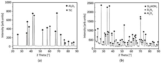 Two types of cutting inserts made of Al2O3/TiC ceramics (round shaped) and SiAlON ceramics (square shaped) were used (Figure 6) in conducting experimental studies. X-ray diffraction patterns of samples made of Al2O3/TiC and SiAlON ceramics are shown in Figure 7. The analysis was performed on a Bruker D8 Advance diffractometer with monochromatic CuKα radiation and shooting in the angle range 20–90° 2Θ. Main parameters used in experiments of ceramic inserts are presented as follows: