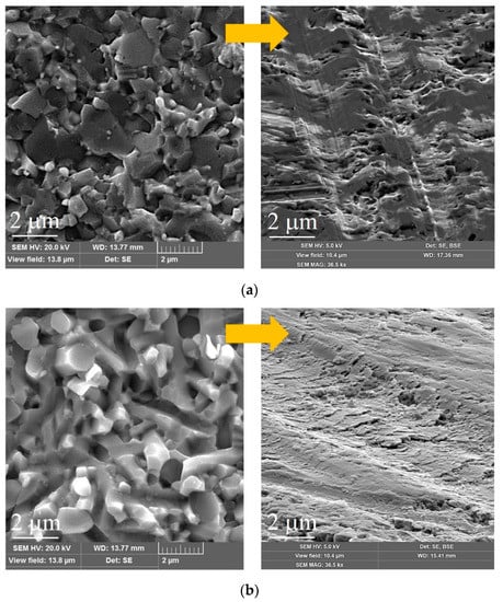 Figure 8 shows the SEM images that illustrate the transformation in the microstructure of the surface layer of sintered Al2O3/TiC and SiAlON ceramic samples, which occurs after grinding as a result of the impact of diamond grains of the grinding wheel and local plastic deformation during high-speed heating and subsequent cooling of the subsurface layers. It can be seen that diamond grinding significantly changes the surface microstructure of the ceramics that were formed at the stage of their sintering. It should be noted that the initial microstructure is shown on the sample’s fractures. The structurally transformed surface layers of Al2O3/TiC and SiAlON ceramic specimens contain numerous defects, such as deep grooves, microcracks, and craters in the place of torn grains. The defective surface layer perceives the entire complex of operational loads, and its condition is paramount for the friction and wear processes of the ceramic sample contact surfaces.