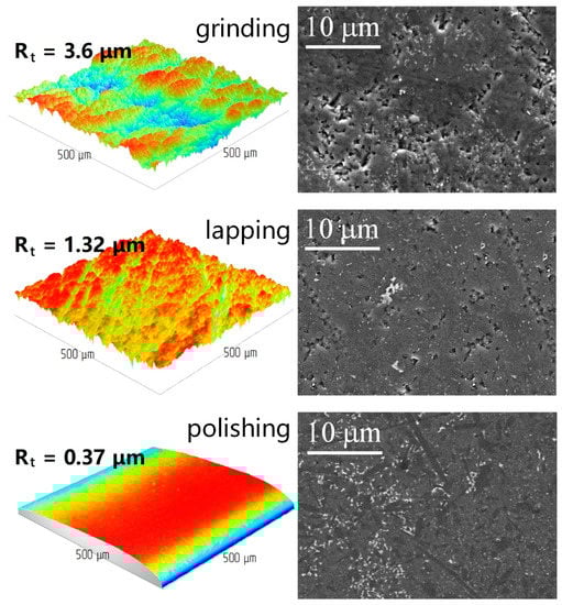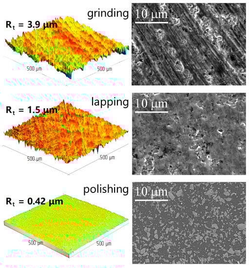The use of additional processing, such as lapping and polishing for the ground ceramic samples, leads to pronounced changes in the surface layer state. Typical 3D profilograms and SEM images of the microstructure of ceramic samples after various processing options are shown for Al2O3/TiC (Figure 9) and SiAlON ceramic samples (Figure 10). The use of additional lapping significantly reduces the depth of the defective layer in terms of the Rt parameter (by a factor of 2.6–2.7):