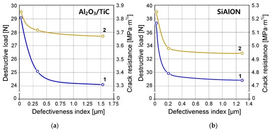 Dependences of the breaking load during edge chipping (1) and crack resistance (2) on the state of the surface layer of ceramic samples, characterized by the index of defectiveness: Al2O3/TiC (a) and SiAlON (b).