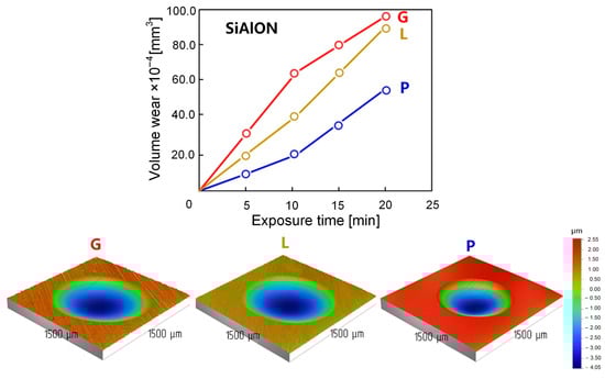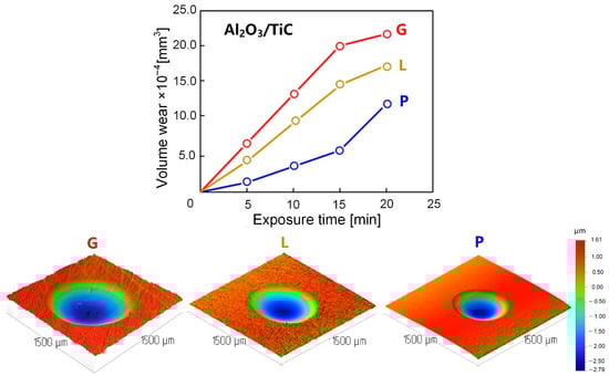 Figure 12 and Figure 13 show the dependences of the volumetric wear of Al2O3/TiC and SiAlON ceramic specimens on time of abrasive exposure and 3D profilograms of specimen wear holes after 20 min of testing. The presented dependences show the wear kinetics of ceramics with a different state of the surface layer (the index of defectiveness) and their resistance to abrasive wear. It is noticeable that the high defectiveness of the surface layer (G samples) significantly reduces the ability of ceramics to resist abrasive wear. The P samples with a minimum index of defectiveness, which underwent additional lapping and polishing compared with other groups of the ceramic inserts under study, showed significantly lower volumetric wear values throughout the tests. The values of volumetric wear of the P samples made of Al2O3/TiC and SiAlON, which have a minimum index of defectiveness, were by about 1.5–1.9 times less than for samples from other control groups (G and L samples) after 20 min of abrasive action. Thus, additional lapping and polishing of ceramic cutting inserts significantly improve their resistance to abrasion wear under normal conditions (20 °C).