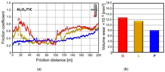 Change in the coefficient of friction depending on the friction distance of Al2O3/TiC ceramic samples with a different state of the surface layer (a) and volumetric wear of the samples (b) after passing a distance of 200 m at high-temperature friction of sliding.