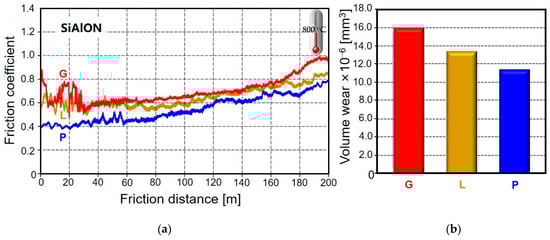 The experimental curves presented in Figure 14 and Figure 15 show that the samples with the lowest index of defectiveness (P samples) compared to other groups (G and L) of the samples under study show a slight decrease in both the average value of the coefficient of friction when heated to a temperature of 800 °C and also the nature of the change in the coefficient of friction over time. The coefficient of friction changes abruptly for samples with the highest index of defectiveness (G samples). Especially, for the samples made of Al2O3/TiC: first, the coefficient of friction increases, reaching maximum values, then sharply decreases, increases again, and only stabilizes with time. Such a nonmonotonic change is the result of the alternation of the processes of the adhesion of contact surfaces and the destruction of the “bridges” of adhesive bonds. The change in the coefficient of friction over the entire friction path is monotonic for Al2O3/TiC and SiAlON ceramic samples that underwent additional lapping and polishing (P samples), which indicates more favorable conditions for frictional interaction with the counter body. It can be assumed that the noted changes in the nature of the contact interaction under the friction of sliding conditions are also associated with a significant decrease in the roughness of the surface layer of ceramic samples, which occurs after polishing [69,70].