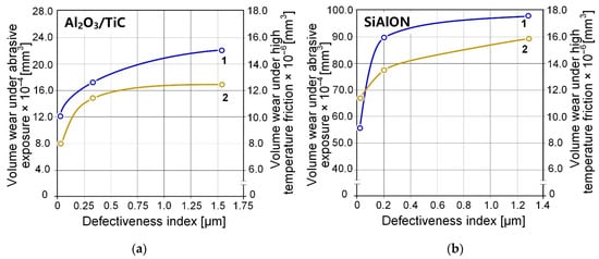 Dependences of volumetric wear under abrasive action (1) and high-temperature friction (2) of ceramic samples with a different state of the surface layer, characterized by the index of defectiveness: Al2O3/TiC (a) and SiAlON (b).