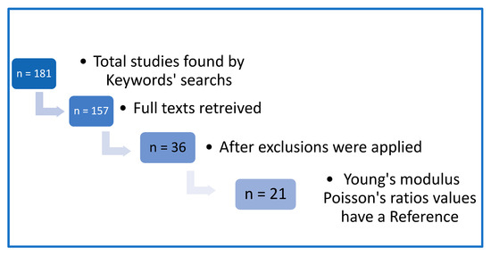 Designing an FEA study that has a paired mechanical test using commercial materials requires the following information: Young’s modulus and Poisson’s ratio. Accessing the studies openly through PubMed may prove critical for researchers who have limited access to subscription-based journals. This was obtainable for less than half of the articles. The abstracts of inaccessible articles serve as a substitute for determining if the article is relevant.