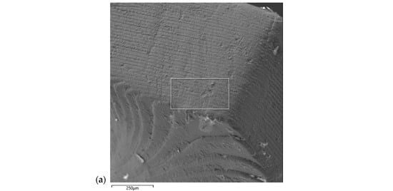 According to the data from scanning electron microscopy (Figure 3a,b), the structure of the sample was analyzed at various levels. In particular, the size of the layer that was sintered at once when building the 3D printer blank was determined, which after sintering amounted to l ≈ 20 μm, indicating a 33% material shrinkage. The microstructure of the layers is characterized by sintered grains (with an estimated size of about 5 μm) with low inter-granular porosity. The grains tend to be isotropic, although in some cases, there is a large spread of grain sizes from 2 μm to 12 μm. This can be explained by the absence of sintering additives or a low content of sintering additives that do not affect the rate of grain growth. From the analysis of microphotographs, it can be concluded that the sample does not have macroscopic building defects and has layers of uniform thickness, minor defects—cracks, colorings, sintering defects were not detected, which in total indirectly indicates high mechanical properties of the printed product. Based on the micro X-ray spectroscopic analysis (the highlighted area in Figure 3a), it can be concluded that it is practically pure aluminum oxide, the detected Fe and Si impurities indicate surface contamination, the presence of Na is a characteristic feature of aluminum oxide obtained by the Bayer method (Table 2). According to XRD data, the sample consists of corundum (PDF № 10-173), and no other impurities have been identified.