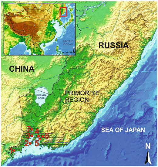 - Obata, H.; Vostretsov, Y.E.; Miyamoto, K.; Shiba, R.; Furusawa, Y.; Kamikawa, M.; Kim, E. Archaeological collections in the Posiet Bay; Shimoda Print Joint Stock Company Publishing: Kumamoto, Japan, 2007. [Google Scholar]