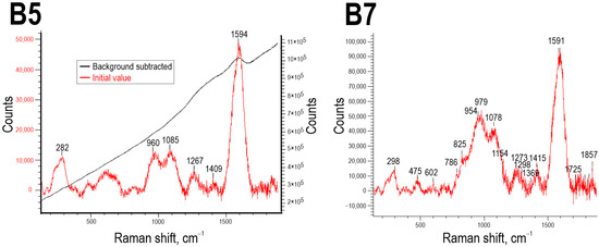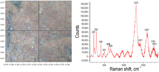 - Hernanz, A.; Bratu, I.; Marutoiu, O.F.; Marutoiu, C.; Gavira-Vallejo, J.M.; Edwards, H.G.M. Micro-Raman spectroscopic investigation of external wall paintings from St. Dumitru’s Church, Suceava, Romania. Anal. Bioanal. Chem. 2008, 392, 263–268. [Google Scholar] [CrossRef]