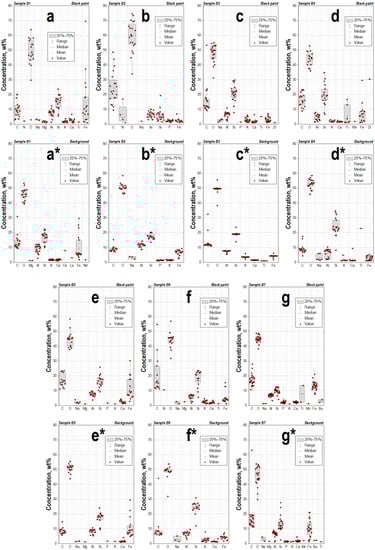- Stewart, J.D.; Adams, K.R. Evaluating visual criteria for identifying carbon- and iron-based paints from the Four Corner region using SEM-EDS. Am. Antiq. 1999, 64, 675–696. [Google Scholar] [CrossRef]