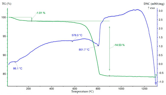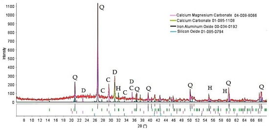 The DSC data showed two main endothermic effects. The first was a low-intensity endothermic effect with a peak at 86.1 °C, accompanied by a change in mass by 1.01%, associated with the release of adsorbed water. The second, more intense endothermic effect, in the temperature range 700–900 °C with a minimum at 801.7 °C, was related to the decarbonization of dolomite and the dissociation of calcite, as evidenced by a mass change of 14.53%. A minor endothermic effect with a minimum at 578 °C was associated with the reversible polymorphic transformation of α-quartz into β-quartz. It can be noted that the TG-DSC data were in agreement with the XRD.