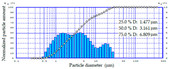 Due to the fact that the fineness of the feed materials has a significant impact on the quality and properties of foamed glass-ceramics, the particle size distribution range of ground tailings was established (Figure 2).
