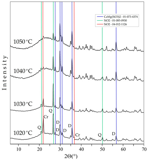 In the XRD pattern of samples sintered at temperatures of 1020–1050 °C, the presence of a glass phase, as well as diopside, quartz, and cristobalite, was noted. An increase in the halo intensity in the angle range of 15–35°, along with the sintering temperature, indicated an increase in the content of the glass phase. With an increase in temperature, an increase in the diopside reflections intensity was observed as well as a decrease in the quartz and cristobalite peaks intensity (Figure 4).