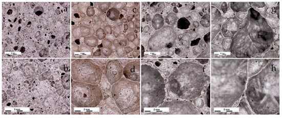 As is known, in order to obtain foamed glass-ceramics with improved performance, a uniform finely porous structure is required. The macrostructure of the samples foamed at different temperatures is shown in Figure 5. An analysis of the micrographs showed that the structure of the foamed glass-ceramics depended on temperature. Samples obtained at a temperature of 1020 °C were characterized by a finely porous structure (Figure 6a,b) with randomly located pores with a size of 0.16–2.67 mm. The structure of the foamed glass-ceramics obtained at a temperature of 1030 °C approached the optimum. The presence of evenly distributed polydisperse (in size) pores, which were separated by dense and similar cross-section interpore partitions, was recorded. As can be seen from Figure 6c,d, the pore structure was represented by cells 1.29–3.87 mm in size, predominantly close to a round shape, remotely resembling a honeycomb structure in appearance. Such a space–volume configuration is the most optimal for foamed glass-ceramics capable of being resistant to sufficiently large loads at a minimum density value. The thickness of the interpore partition in the sample was 0.14–1.16 mm. At a temperature of 1040 °C, an increase in the number of larger pores of 4.37–5.60 mm in size was observed (Figure 6e,f). An increase in temperature to 1050 °C led to a change in porosity towards the predominance of large pores with an average size of 6.70–8.00 mm (Figure 6g,h). The presence of single pores up to 10 mm in size is possible. Increasing the sintering temperature leads to enlarged pores and the breakthrough of the gaseous phase as a result of a decrease in the viscosity and surface tension of the melt. Such a structure is not optimal, which is confirmed by an increase in water absorption, as well as a decrease in the material strength. At the same time, with an increase in the sintering temperature of 30 °C, water absorption increases by a factor of 2.1.