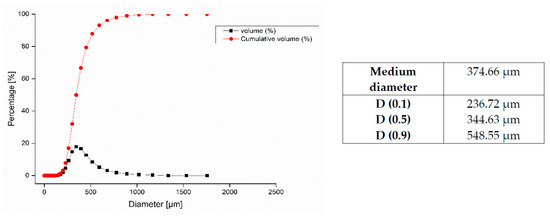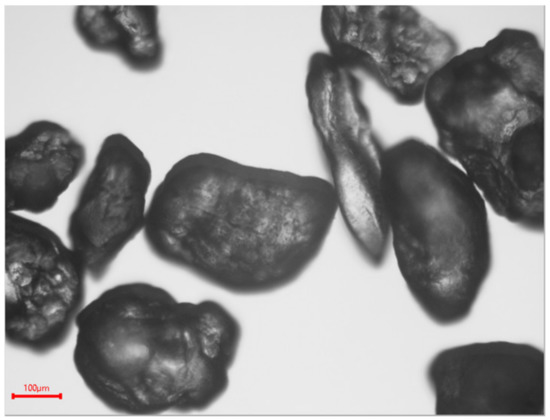 For the sandblasting tests, the transparent spinels were eroded using a horizontal type of sandblasting device [33]. The latter complies with DIN 50 332 standards and ASTM G76. A natural sand from the region of El-Oued (Southeast of Algeria) was used as eroding material. Figure 1 showed that this sand has various grains with different shapes and with an elongated index (Ei = Dmax/dmax) of 1.44. It has a fairly homogeneous particle size ranging between 250 and 500 µm with an average particle size of 374 µm (Figure 2). The chemical composition of this sand was indicated in Table 2. The fabricated spinel samples were sandblasted on one side under the following conditions:
