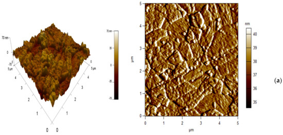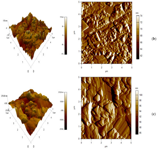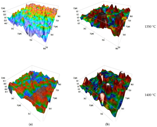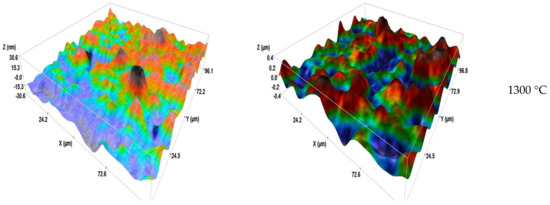 The changes in the roughness value quadratic height (Sq: extended surface roughness parameter relating to the area) of different transparent samples before and after erosion are shown in Figure 12. It is observed that the roughness in the raw state is low in the case of samples sintered at 1300 and 1350 °C (75 and 73 nm). These results show that the samples undergo good polishing with fine microstructures; except in the case of spinel sintered at 1400 °C, which has a high Sq of the order of 125 nm. Furthermore, when the roughness results after sandblasting are examined, it can be noticed that the values of Sq increase from 75 nm up to 134 nm for the sample sintered at 1300 °C. For spinel sintered at 1350 °C, the Sq reaches 139 nm. As for spinel sintered at 1400 °C, the roughness reaches 167 nm.