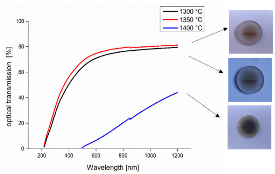 Figure 5 shows the spectra of real in-line transmission of the samples sintered at different temperatures. It can be observed that the samples sintered at 1300 and 1350 °C have almost the same high RIT in the visible range (400–800 nm) and that the best optical real in-line transmission is reached with samples sintered at 1300 and 1350 °C. This RIT decreased abruptly in the sample sintered at 1400 °C, which has a very low transmission. The decrease in the transmission at high temperature can be explained by the strong contamination by carbon during sintering; Hammoud et al. [35] showed that a contamination occurred by carbon clusters originating from the powder and the environment of the SPS (graphite foil, die and felt). A high SPS temperature may further favor the diffusion from the carbon clusters, which explains the increased light absorption observed in samples sintered at 1400 °C. However, the carbon contamination can be reduced even slightly by a thermal annealing under air, as shown by Zegadi et al. [3]. Not only carbon contamination but also grain size may be an important parameter influencing transmission, as shown by Rothman et al. [36]. It should be noted that our results regarding transmission as a function of SPS temperature are in good agreement with those in the literature [37,38].