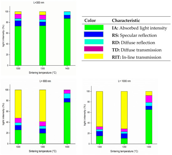 To better understand the effect of sintering temperature on the different optical properties of the fabricated transparent spinel, we present the intensity of transmitted, reflected, absorbed and scattered light in Figure 6 as a function of three different wavelengths. The first conclusion that can be drawn is that the RIT increased with the increase in the wavelength, while the absorbed intensity, the diffuse transmission and the diffuse reflection decreased. The second conclusion is that the sample sintered at 1350 °C exhibited the best transmission at any wavelength, whereas the sample sintered at 1400 °C exhibited the lowest transmission at any wavelength. The poor optical transmission of the sample sintered at 1400 °C can be explained by carbon contamination during sintering, where this sample has been identified as a potential cause of a decrease in optical properties [35,39,40].