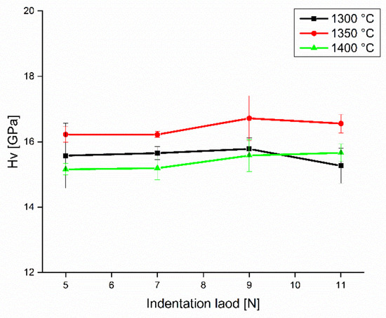 The variation of Vickers hardness of the sintered specimens as a function of indentation load is illustrated in Figure 7. It can be clearly seen that the hardness of the samples sintered at 1350 °C is higher than of those sintered at 1300 and 1400 °C, regardless of the indentation load. The observed variation of the hardness of the samples sintered at different temperatures is attributed mainly to the variation of their porosity and grain size (Hall and Petch law) [10]. This is because the reduction in grain size limits the propagation of dislocations, which strengthens the material and leads to an increase in its hardness. Conversely, samples with larger grain sizes demonstrate the lowest hardness values. The larger grain size promotes dislocation propagation, weakening the material and leading to a decrease in hardness.