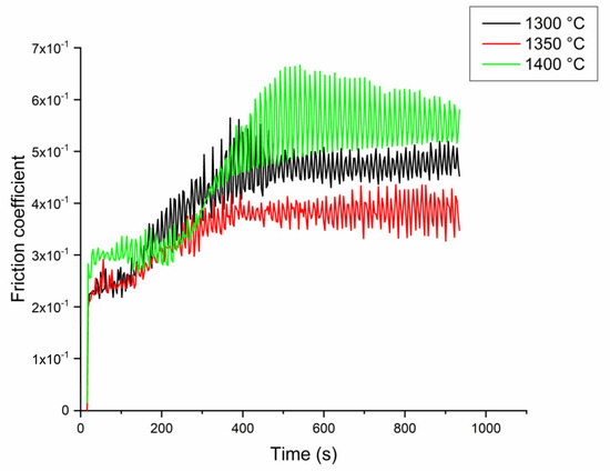 Evolution of friction coefficient as a function of time for the spinel sintered at different temperatures.