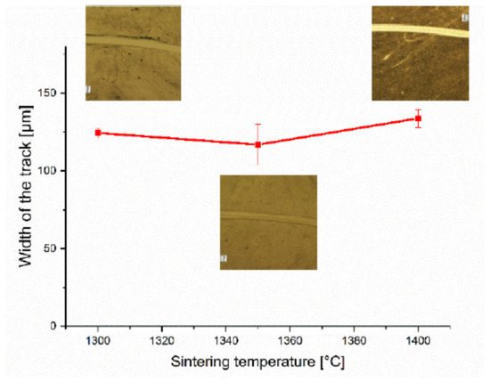 Variation in the track width as a function of sintering temperature.