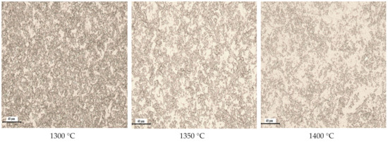 The relative density of the sintered samples was determined according to the Archimedes principle. The density values were 99.65 ± 0.1%, 99.74 ± 0.11% and 99.86 ± 0.03% for the samples sintered at 1300, 1350 and 1400 °C, respectively. The obtained values are the means of five measurements per sample. The slight increase in density with increasing sintering temperature could be explained by the coarsening of grains and promoting of densification by sliding and rearrangement of grains, because the grains bind or weld together as they grow, which can lead to consolidation of the material. Consolidation can cause the relative density to increase because the grains are more tightly bound and the space between them is reduced [34].