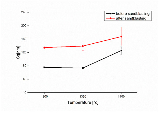 Variation of the roughness of the sintered samples before and after sandblasting.