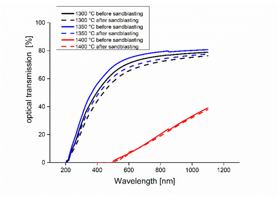 Variation of optical transmission of sintered spinel at different temperatures before and after sandblasting.