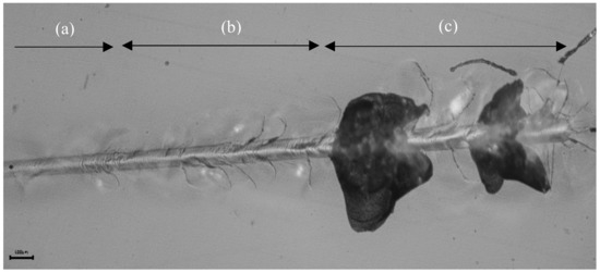 During the progressive scratching tests, it was noticed that when there is an increase in the applied normal load, three successive damage regimes occur [46] (Figure 14): first, a micro-ductile regime where there is a permanent furrow without visible damage (a); second, a cracking regime which is characterized by the initiation of a first radial crack under the effect of a normal critical load (b); and third, a micro-abrasive regime, caused by the normal breaking load (c). In this latter case, the damage becomes more important, and the formation of strong lateral cracks induces spalling, which can cause a removal of material.