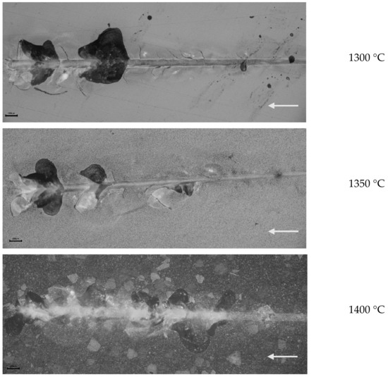 Sample S25CRX 14 sintered at 1400 °C has lower critical load values than the other two samples sintered at 1300 and 1350 °C. This behaviour is explained by the lower hardness of the sample sintered at a higher temperature due to the less fine-grained microstructure. Figure 15 illustrates the scratching behaviour of the different samples according to the sintering temperature. The increase in scratching force leads to large spalling areas when the sintering temperature is higher (1400 °C). The primary damage mechanism during spinel scratching is a brittle fracture. This type of behaviour has also been observed in the case of alumina [47,48,49].