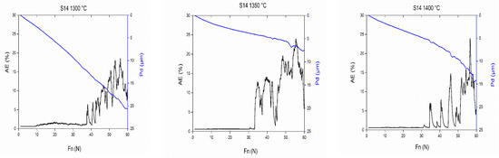 During the scratch test, the system records the depth of penetration (Pd) and the acoustic signals (AE) associated with cracking or chipping. Figure 16a–c presents the variation of penetration depth and the acoustic emission recorded during scratching of transparent spinels, sintered at different temperatures. When the microstructure is finer, and sintering is at 1300 °C, the beginning of the acoustic emission takes place at a higher normal load. As the applied load increases and spalls form, the emission signals become more intense. Indeed, as the normal load increases, the residual penetration depth increases. At the end of the scratch test, we noted the depth reached as follows: 20.6, 7.5 and 14.2 µm, respectively, for the samples sintered at 1300, 1350 and 1400 °C.