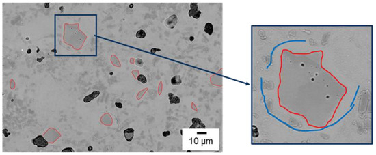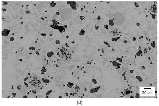 In both images, larger quartz grains can be found in isolated cases, but in the sample lq-1 in the present section, the largest quartz grain with an area of 4180 µm2 (equivalent circle diameter 73 µm (see Figure 3b pink area)) was observed. The largest quartz grain in the sample “high quartz” is only 2269 µm2 in size (equivalent circle diameter 54 µm) (see Figure 3a; yellow area). It is certain that larger quartz grains (over 1000 µm2) are contained in both electro-porcelain samples. Starting from these, larger cracks often occur (see investigation of crack behavior), which in turn could have a negative influence on the material properties.